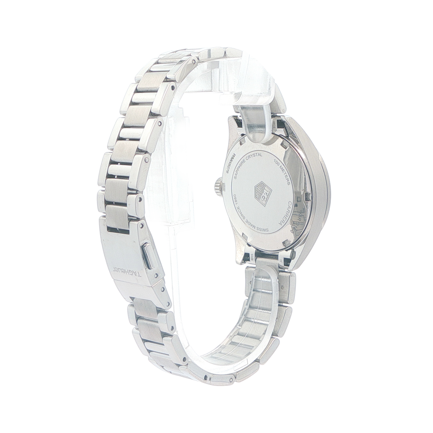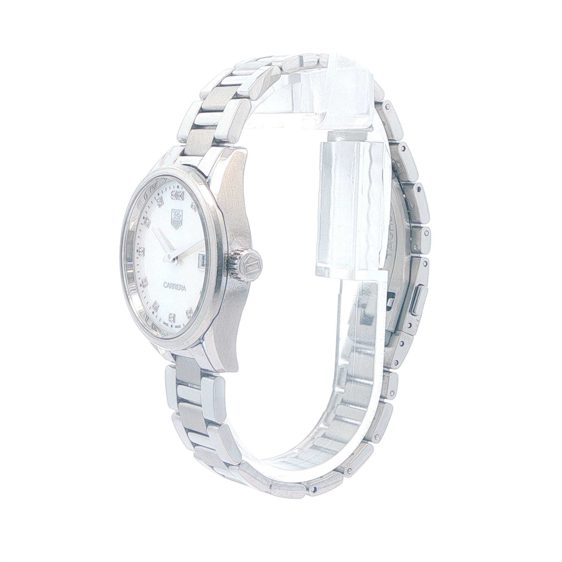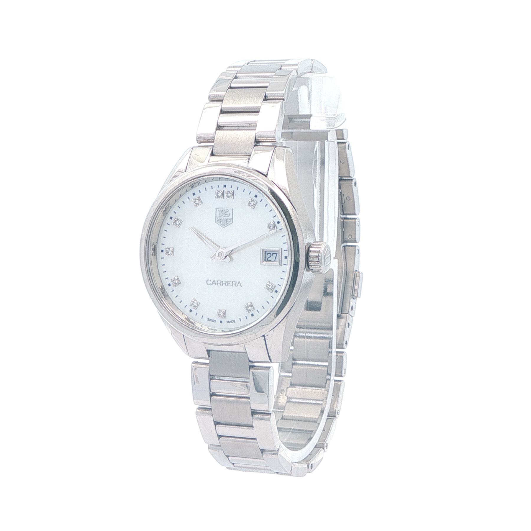This TAG Heuer Carrera, reference, is a sophisticated ladies’ timepiece that blends classic design with refined luxury. Crafted in stainless steel, the 32mm case is paired with a matching polished and brushed bracelet, offering both durability and understated elegance. The standout feature is its luminous white mother-of-pearl dial, delicately accented with diamond hour markers that add brilliance and depth as they catch the light. A discreet date display enhances practicality while maintaining the dial’s clean, balanced aesthetic. Powered by a precise Swiss quartz movement and protected by a scratch-resistant sapphire crystal, this model delivers reliable timekeeping with minimal maintenance. With a water resistance of approximately 100 meters, it is as functional as it is գեղեցously styled. Overall, this Carrera embodies timeless femininity—an elegant, versatile watch equally suited for daily wear or more formal occasions.