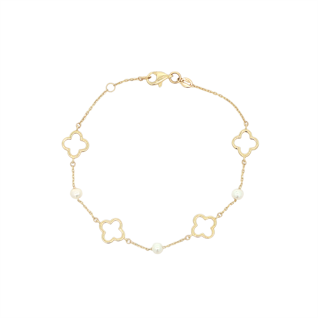 10KT Yellow Gold Fresh Clover and Water Pearl Station Bracelet 6.75 + 0.5"