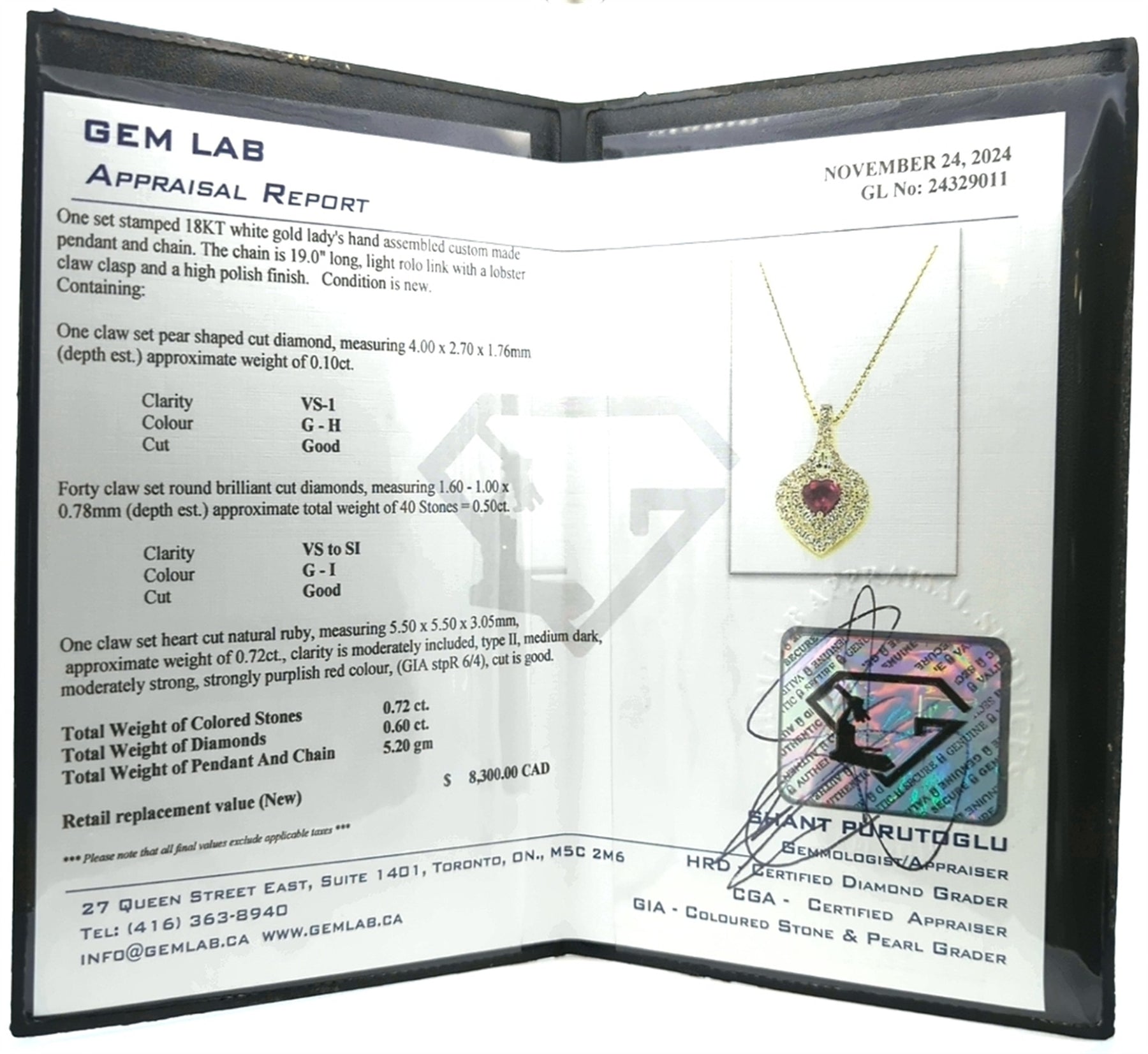 One claw set heart cut natural ruby, measuring 5.50 x 5.50 x 3.05mm, approximate weight of 0.72ct., clarity is moderately included, type II, medium dark, moderately strong, strongly purplish red colour, (GIA stpR 6/4), cut is good.