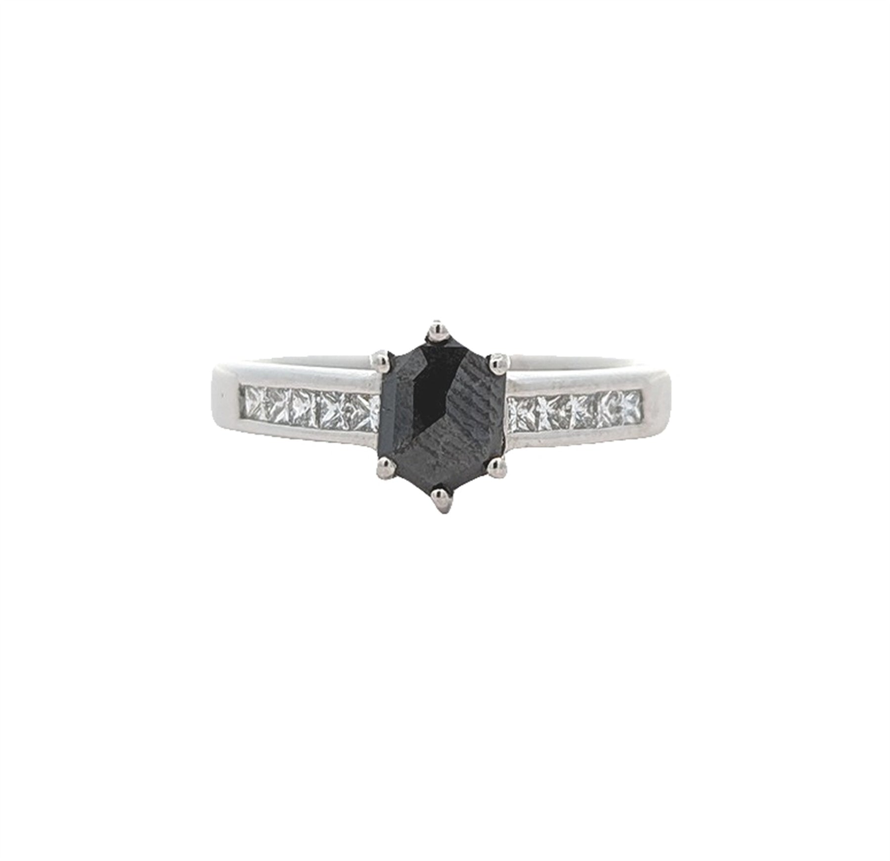 One claw set hexagon shaped cut diamond, mesauring 7.00 x 5.00 x 2.10mm (depth est). approximate weight of 0.73ct.