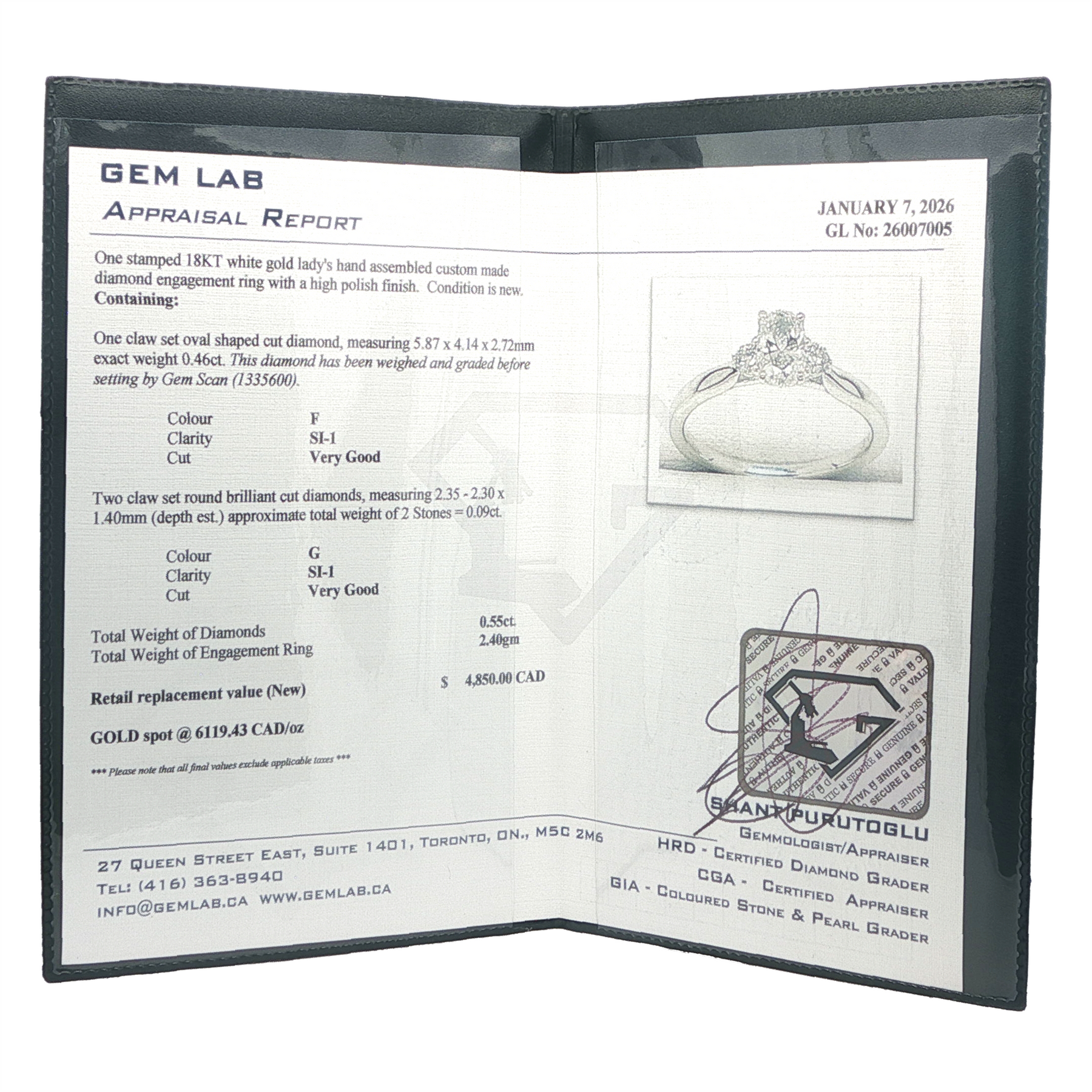 One claw set oval shaped cut diamond, measuring 5.87 x 4.14 x 2.72mm exact weight 0.46ct. this diamond has been weighed and graded before setting by Gem Scan (1335600).