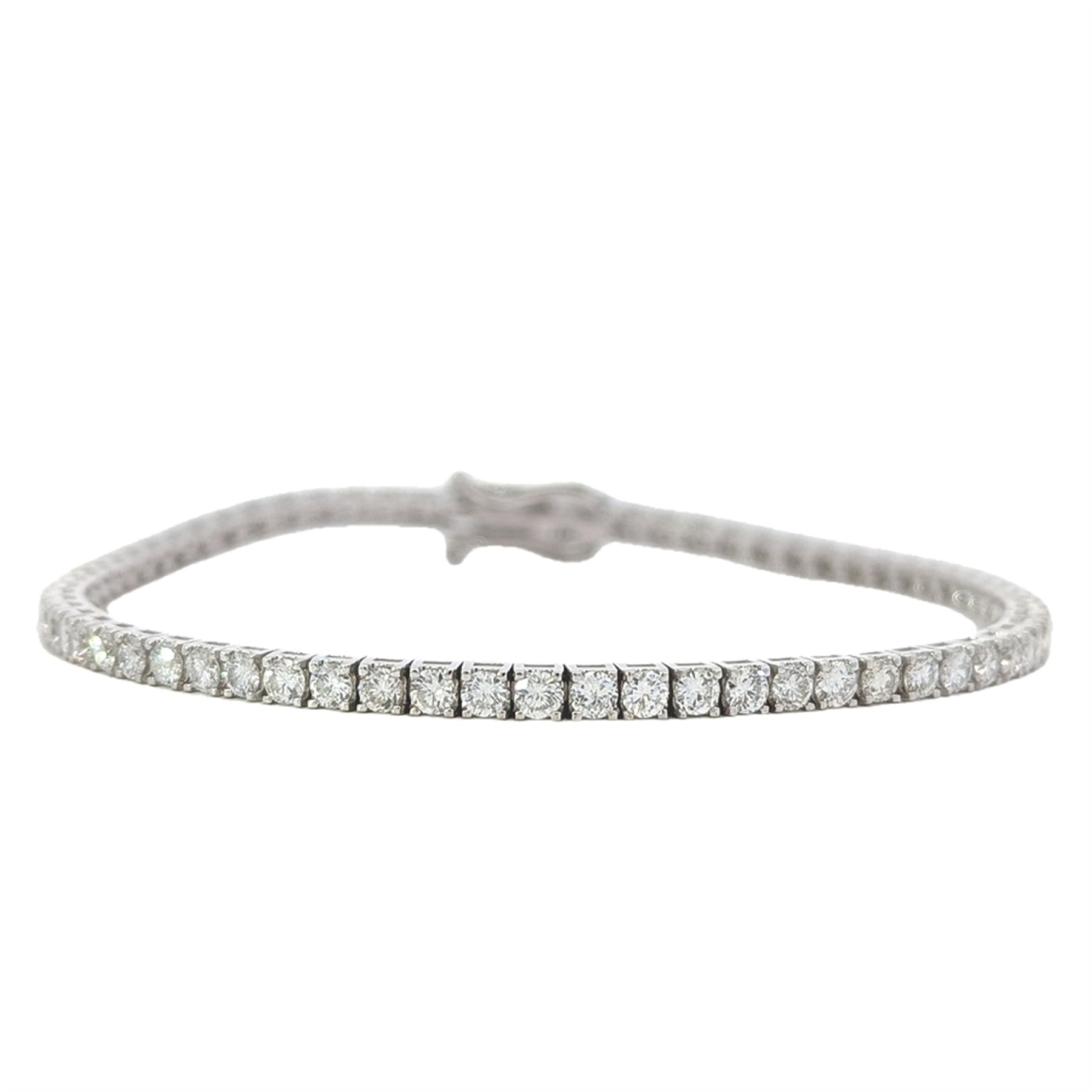 One stamped 14KT white gold hand assembled custom made diamond 7" tennis bracelet with a custom box clasp and 2 safety eight clasps with a high polish finish.