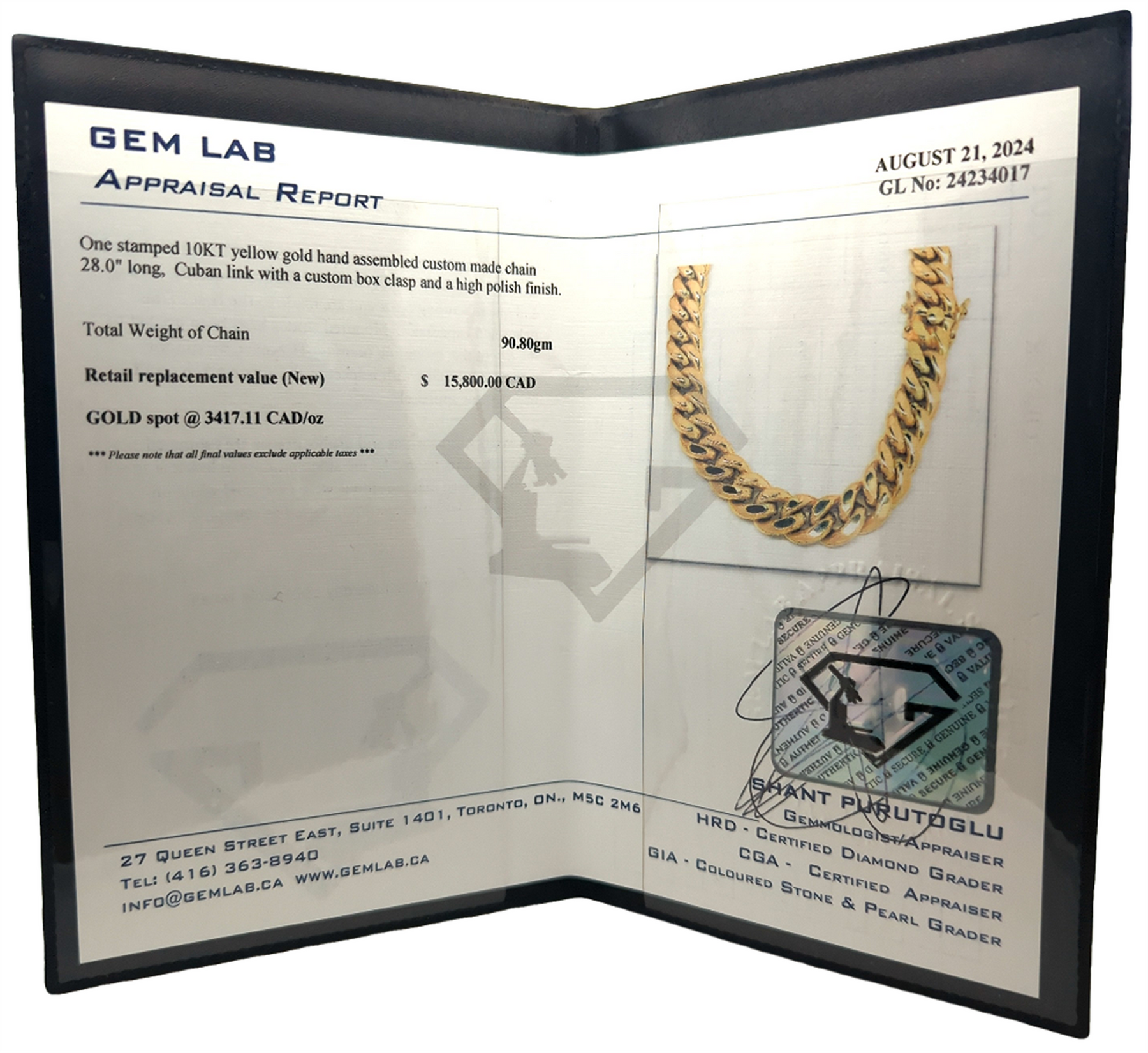 One stamped 10KT yellow gold hand assembled custom made chain 28.0" long, Cuban link with a custom box clasp with a high polish finish.