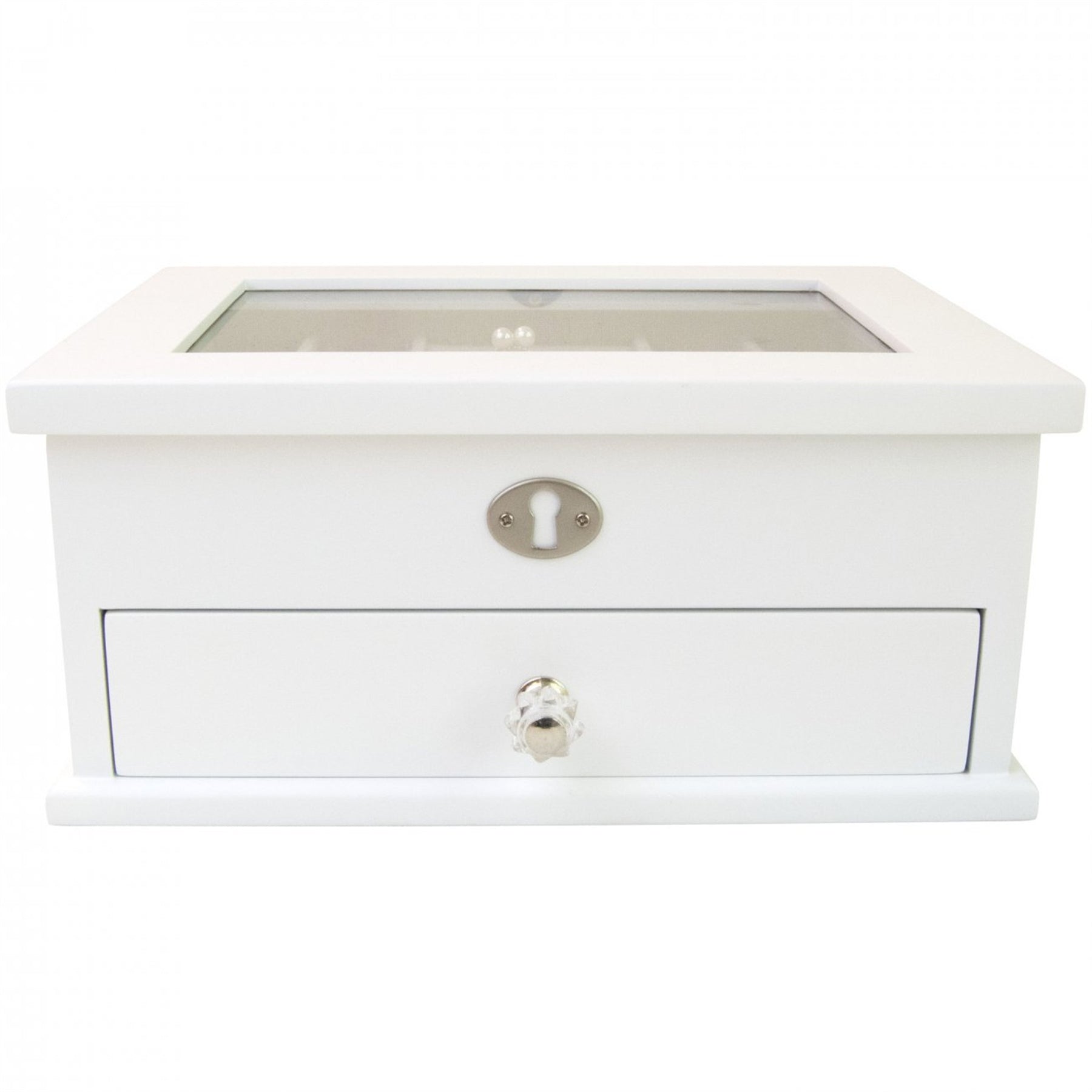 This compact, wooden jewelry box features a glass window lift top, that reveals a collection of compartments to showcase all your prized pieces. White finish with beige linen interior. This organizer features a single drawer storage, as well as 8 smaller compartments and ring roll for easy storage.