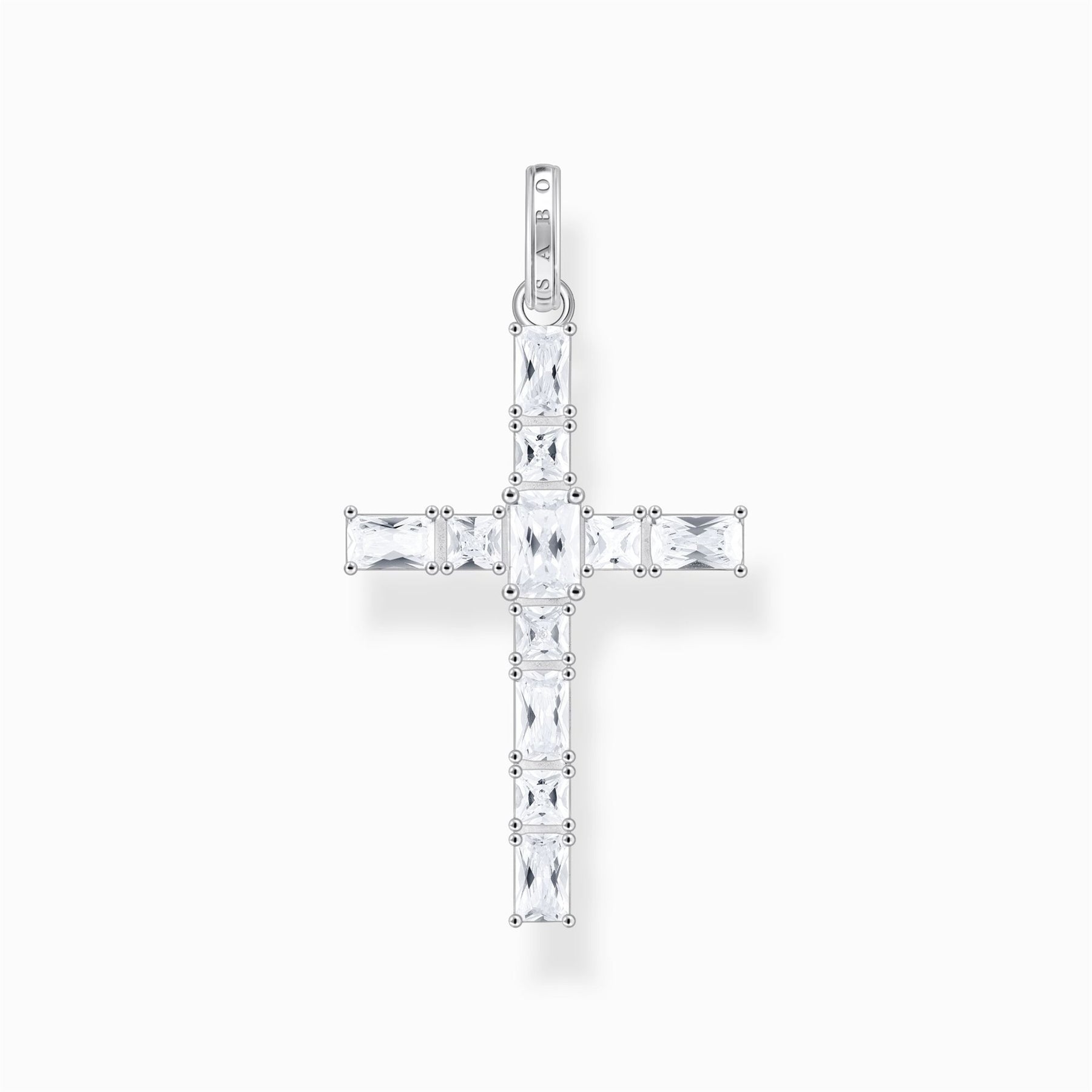 The cross is a symbol that has played a big role for many people and generations, and a popular piece of jewellery. Make this pendant made of recycled silver your personal companion and a symbol of your own story. It is set with big, rectangular and square white zirconia stones with an octagon and princess cut, which make this pendant sparkle and shine intensely when exposed to light. Its big eyelet is engraved with the lettering THOMAS SABO and enables different combinations with a necklace of your choice.
