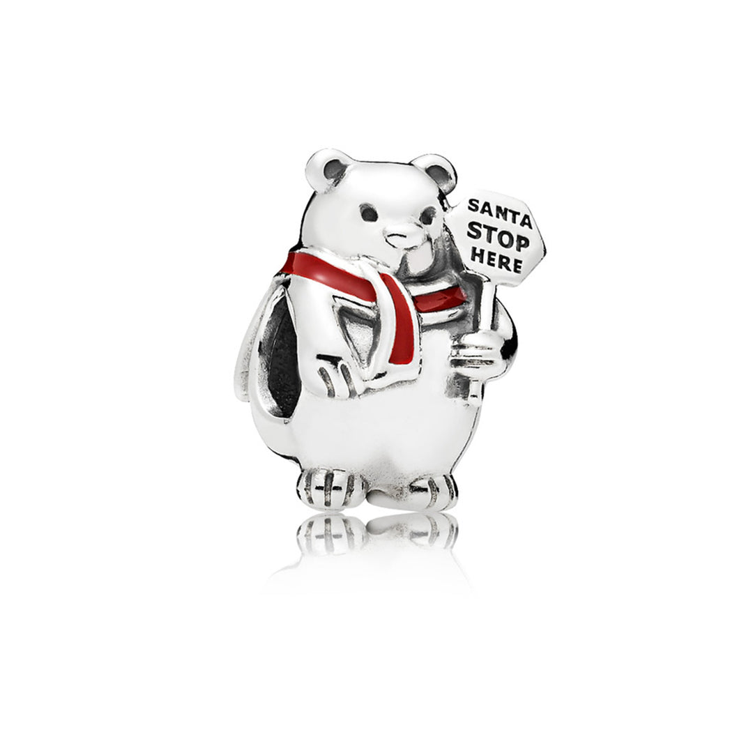 Christmas bear silver charm with berry red enamel and engraving " Santa stop here?
