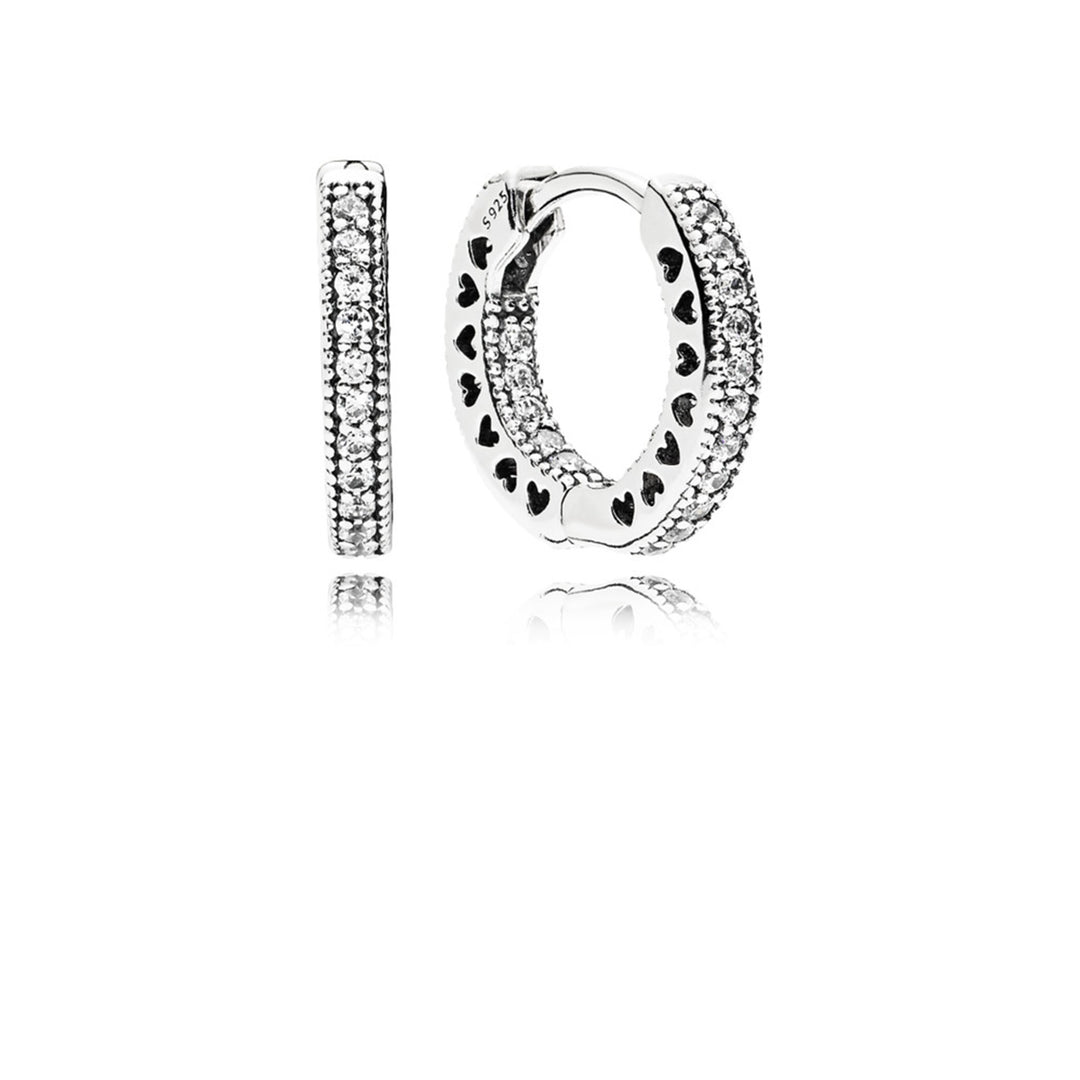 Hoop earrings in sterling silver with clear CZ and cut-out heart details