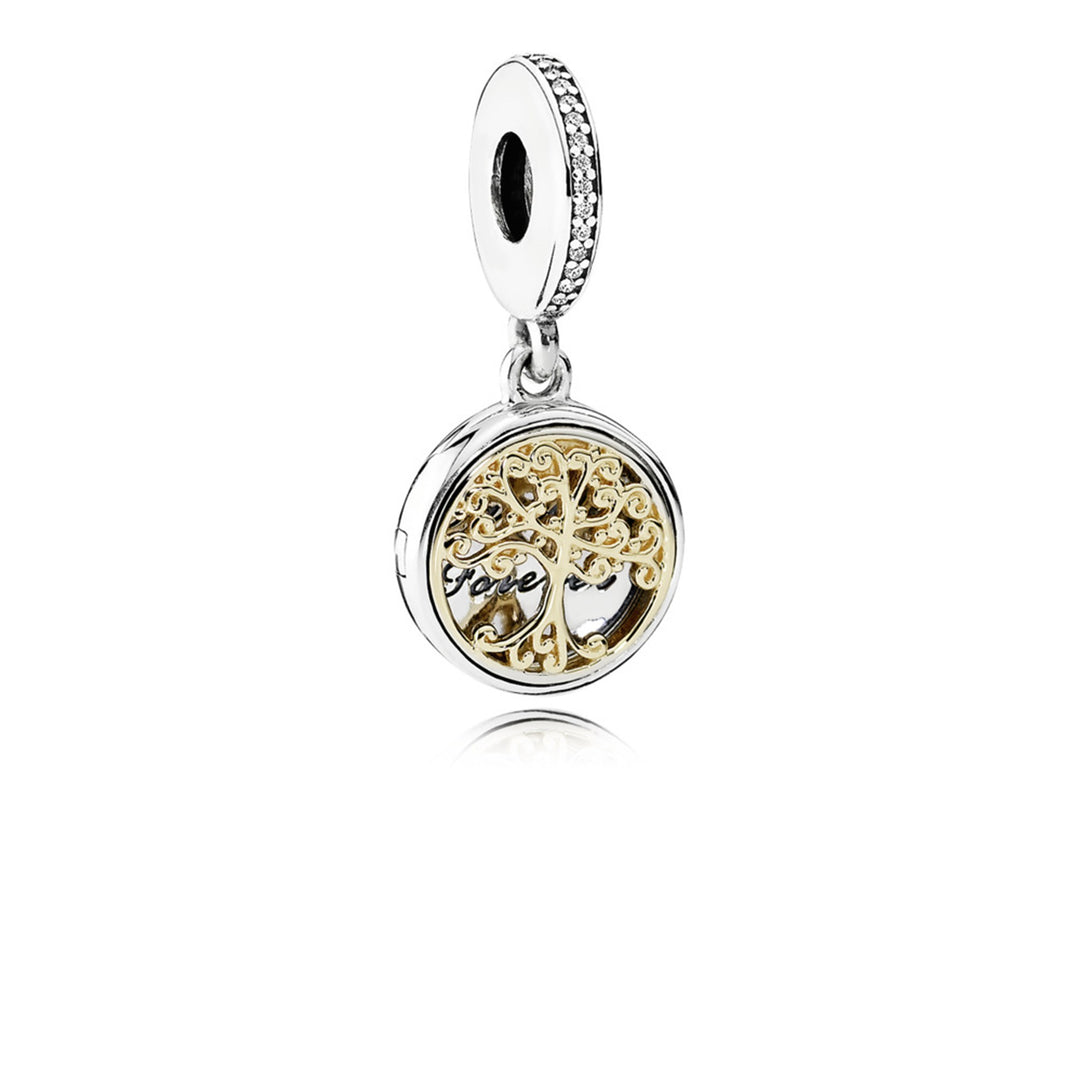 Family tree openable silver dangle with 14k and clear cubic zirconia