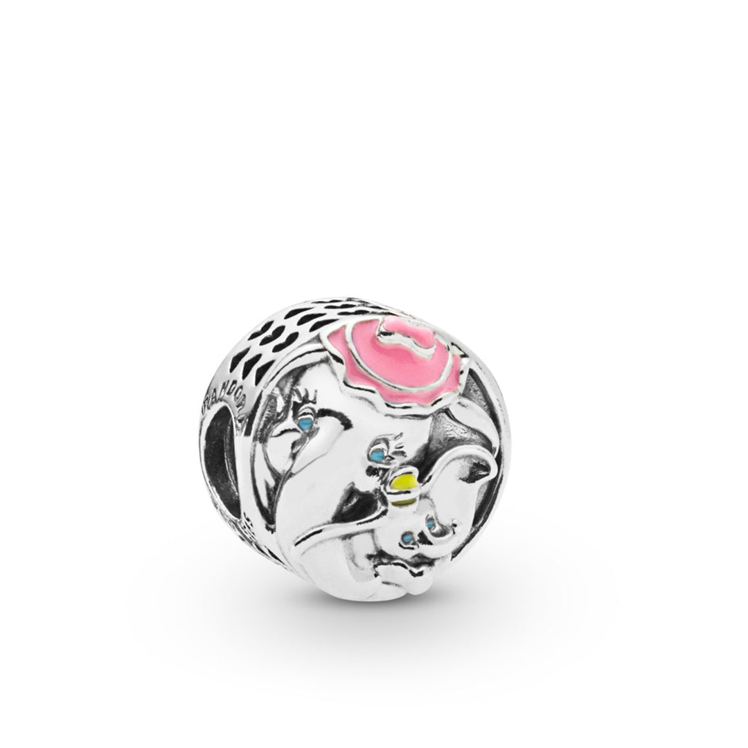 Disney Dumbo and Mrs. Jumbo charm in sterling silver with medium pink, blue mist, sunshine yellow enamel and engraving "My precious love"