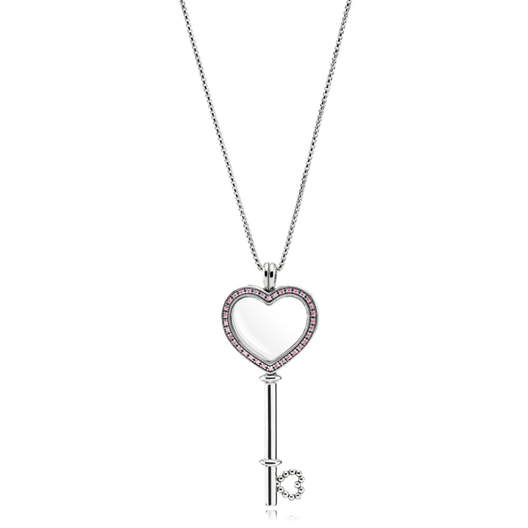 Large Floating Locket Heart Key, Sapphire Crystal & Fancy Fuchsia Pink CZ, Sliding Clasp - 80 cm