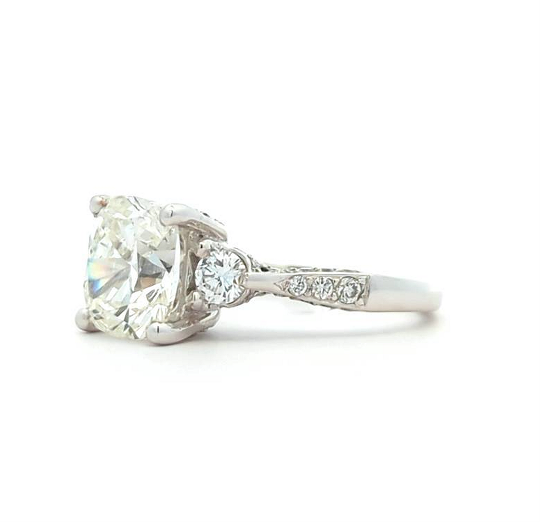 One claw set cushion cut diamond, measuring 9.07 x 8.51 x 5.61mm exact weight 3.20ct. This diamond has been weighed and graded before setting by Gem Scan (1304498).