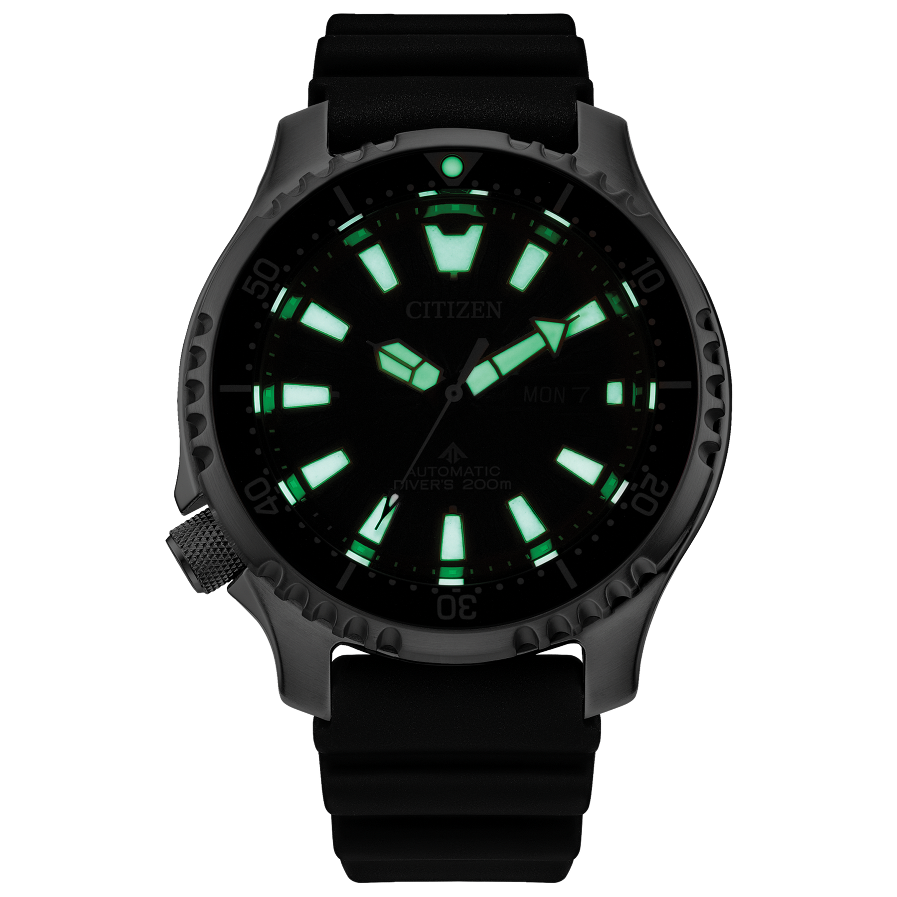 A classic never goes out of style. The newly reimagined Promaster Dive Automatic men’s watch by Citizen goes deeper into the history of the original version of this diving watch that was released in 1989 for the new generation of dive watch enthusiasts. A design element that stands out is the distinctive, serrated bezel design that was inspired by a “Fugu,” the Japanese name for pufferfish. Featuring a 3-piece, 44mm case, anti-reflective sapphire crystal, and durable black polyurethane strap, the black easy grip aluminum ring surrounds the black dial and luminous hands and markers, while the case back features an engraving of a fugu or pufferfish. This technically advanced and stylish men’s sport watch powered by the motion of your wrist comes in an exclusive collector’s dive tank box and is ISO compliant with a screw-down crown and water resistant to 200 metres. Calibre 8204.