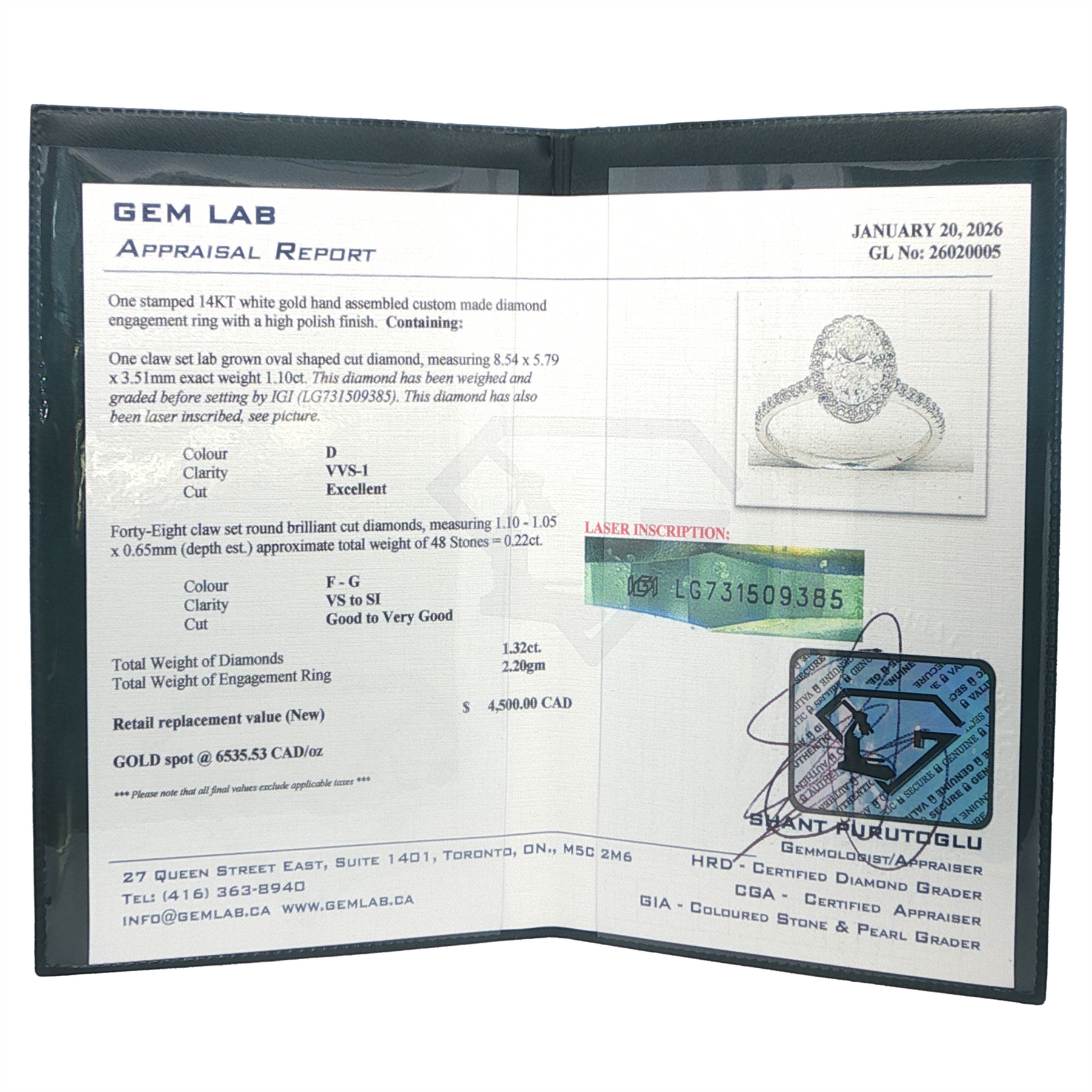 One claw set lab grown oval shaped cut diamond, measuring 8.54 x 5.79 x 3.51mm exact weight 1.10ct. This diamond has been weighed and graded before setting by IGI (LG731509385). this diamond has also been laser inscribed, see picture (on appraisal paper).