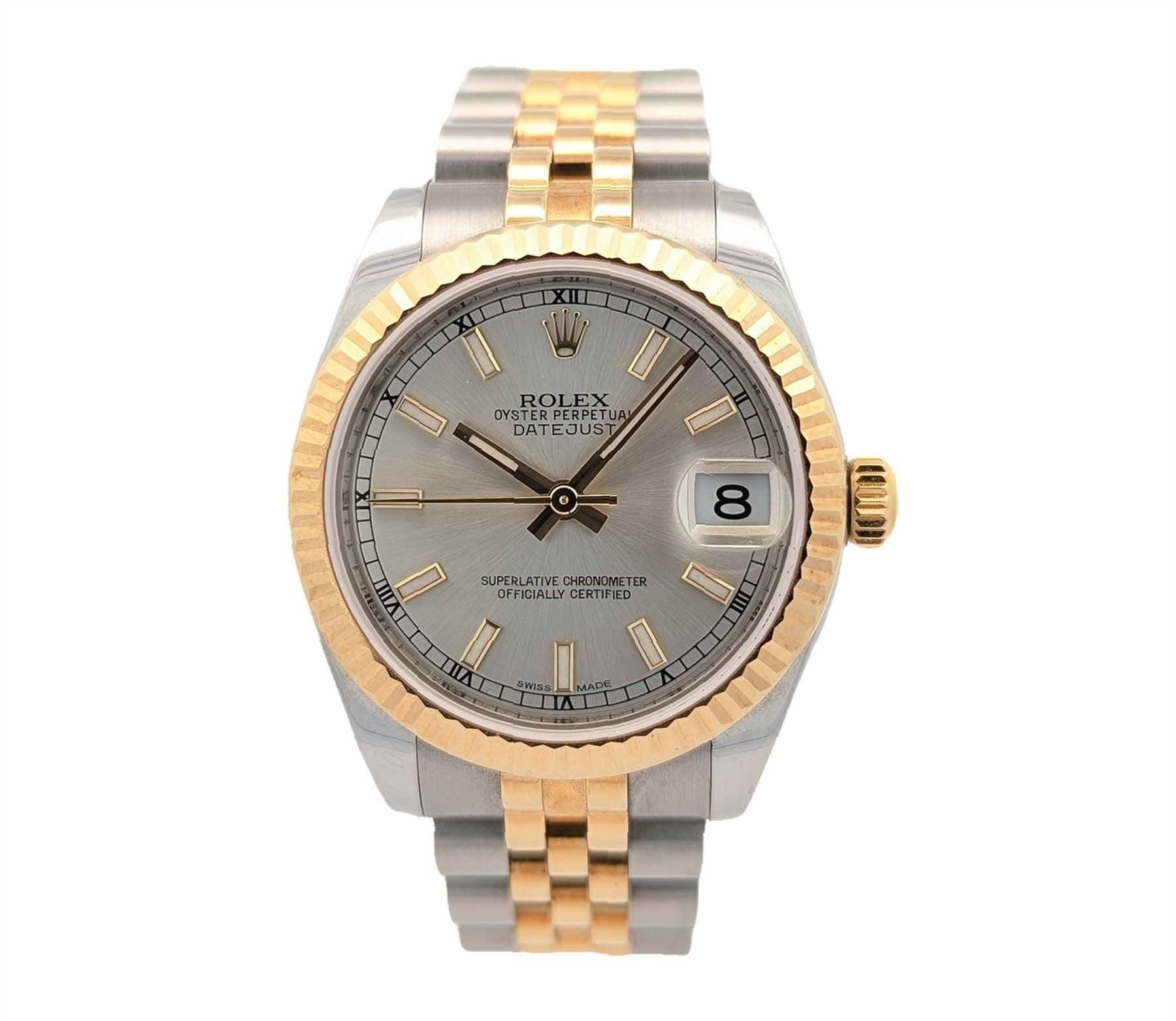 Elevate your wrist with timeless sophistication—this Rolex Datejust is a harmonious blend of classic design and modern refinement. Featuring a 31mm Oystersteel and 18k yellow gold case, this midsize beauty showcases a fluted bezel and a silver dial adorned with luminous hour markers. Its iconic Jubilee bracelet offers unparalleled comfort and elegance, while the self-winding movement ensures precision and reliability. This is not just a watch—it’s a statement of enduring style and prestige.