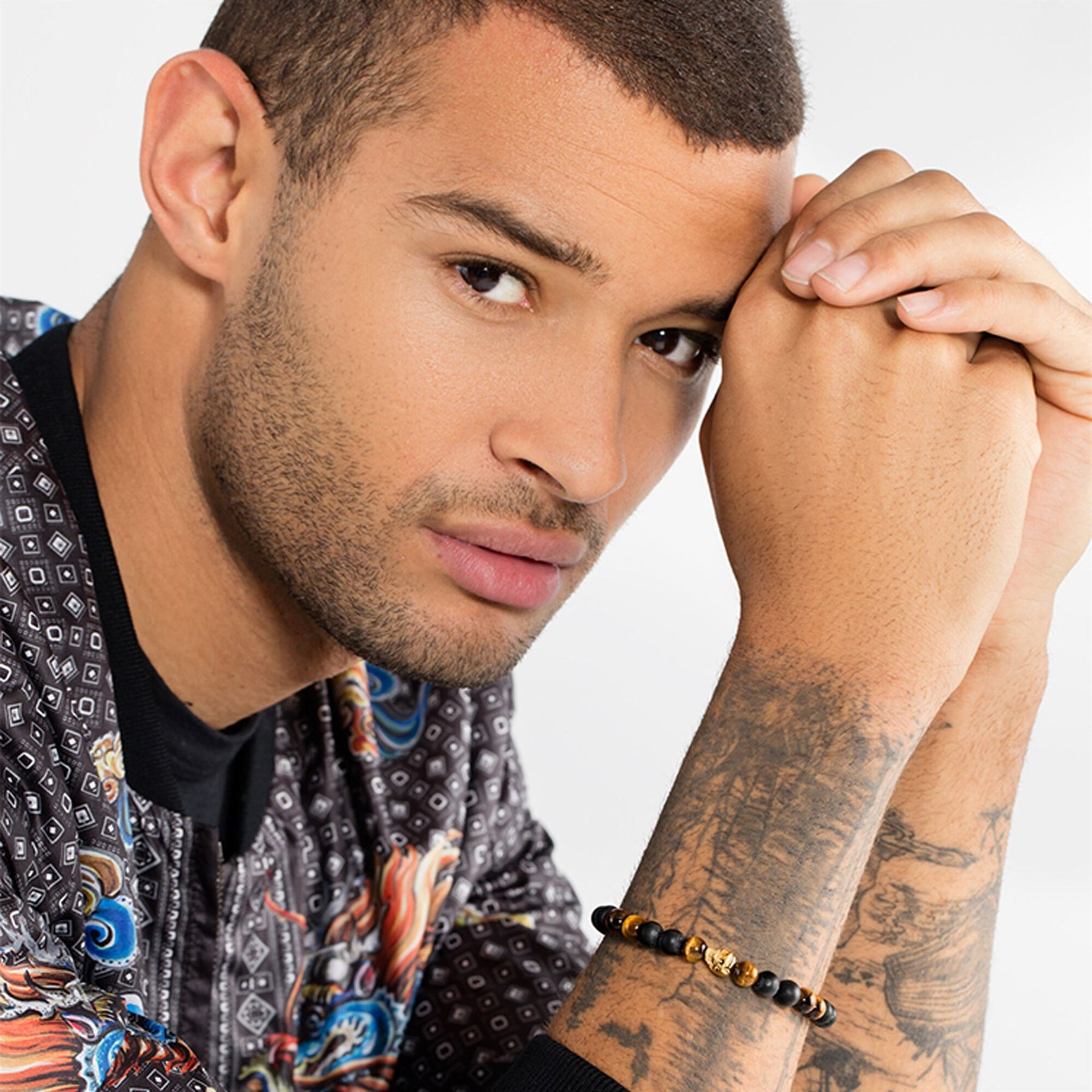 The skull in 925 Sterling silver with 18k yellow gold plating brings an exquisite upgrade to the legendary Rebel at Heart stretch bead bracelet made of matt obsidian and tiger's eye.