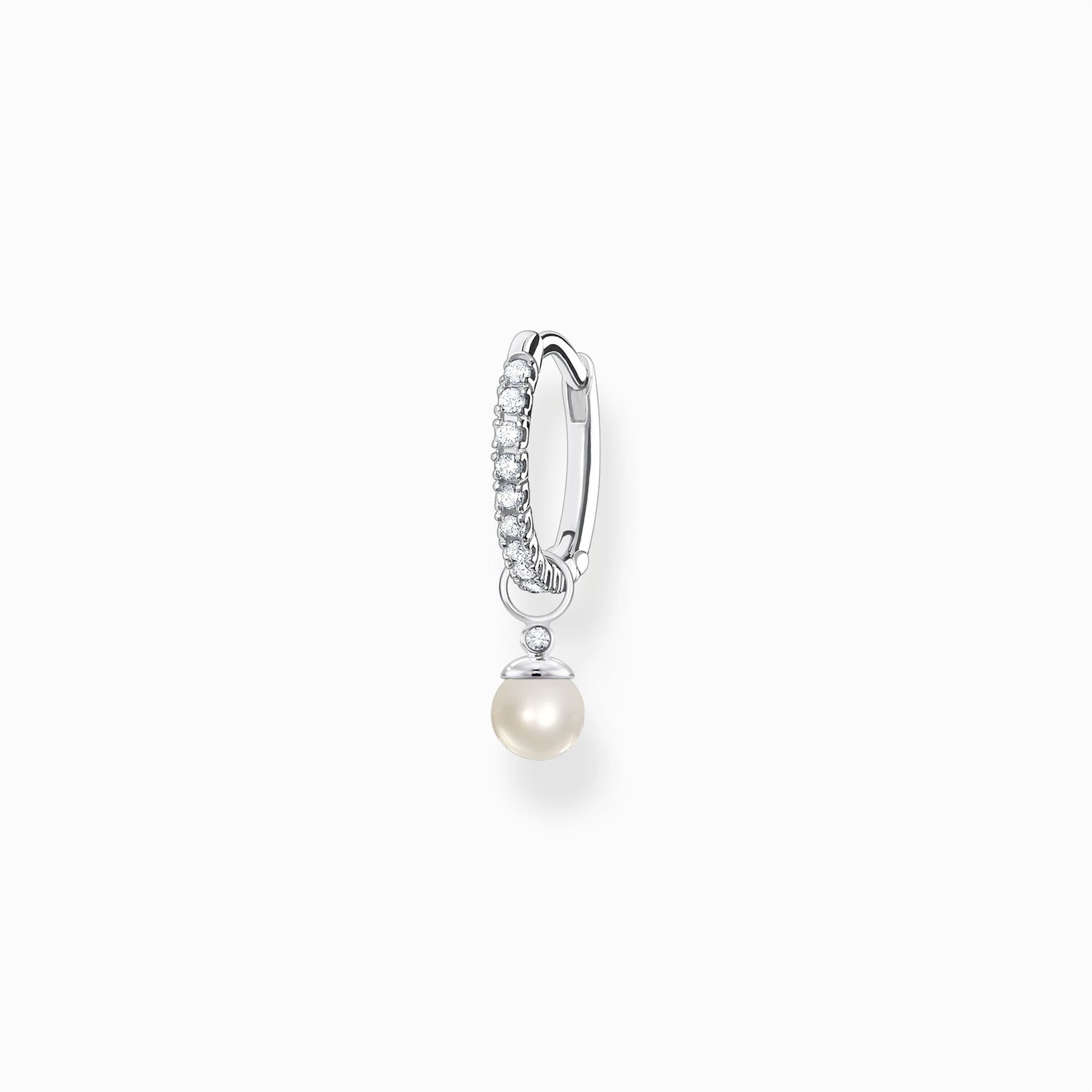 The pendant made of high-quality 925 Sterling silver is decorated with a delicately shimmering freshwater cultured pearl and a white zirconia stone. It can easily be attached to the hoop with the help of an eyelet that has an inner diameter of 2,5 mm. The set is perfect for individual combinations with ear studs, ear cuffs and creoles.