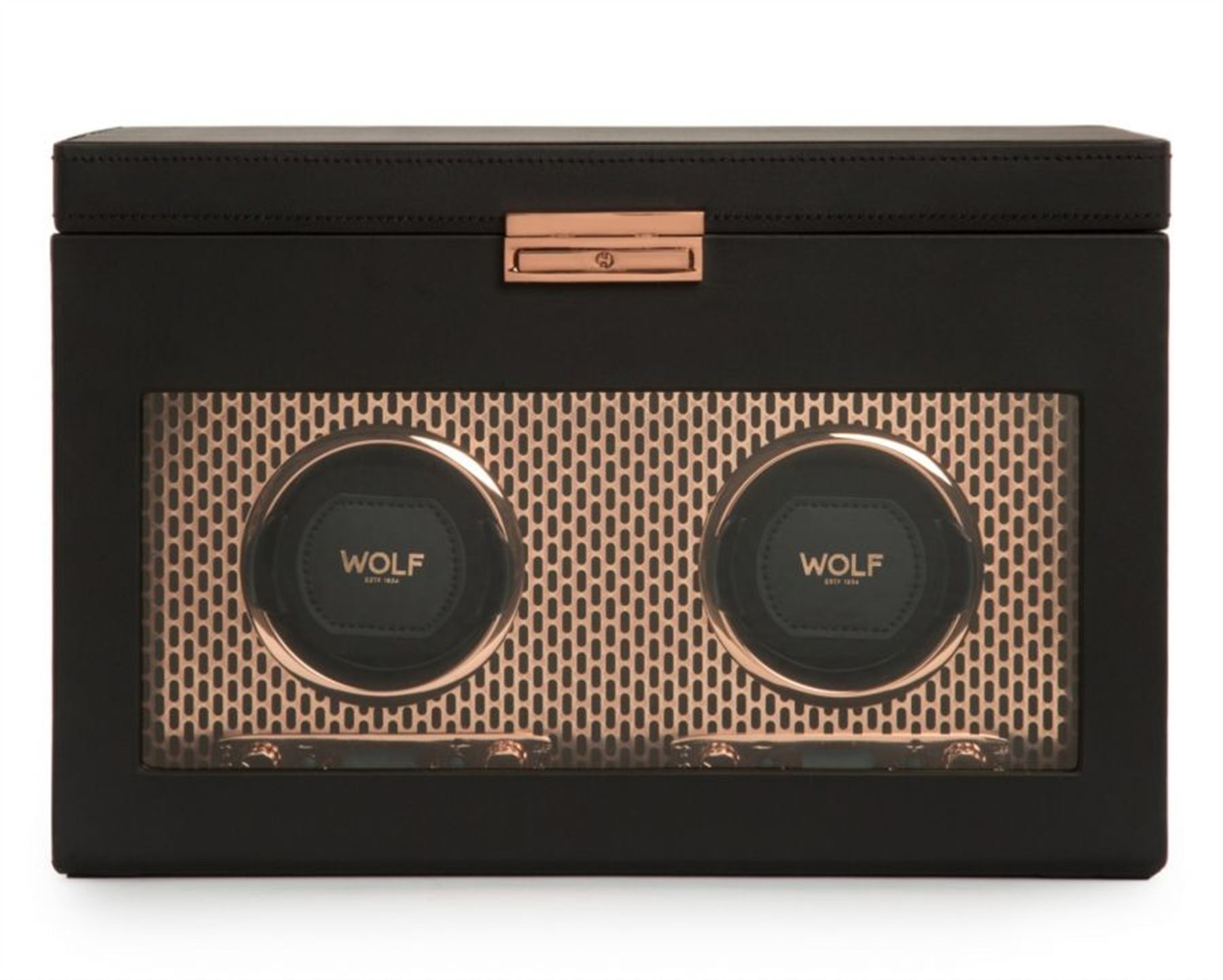 Powder-coated and copper plated laser cut perforated steel melded with clean, sleek lines. AXIS drives a modern, bold look for safekeeping your timepieces. Our patented technology of counting rotations of the axis of your watch guarantees precise turns per day. Bold luxury, faultless design, take AXIS for a spin.